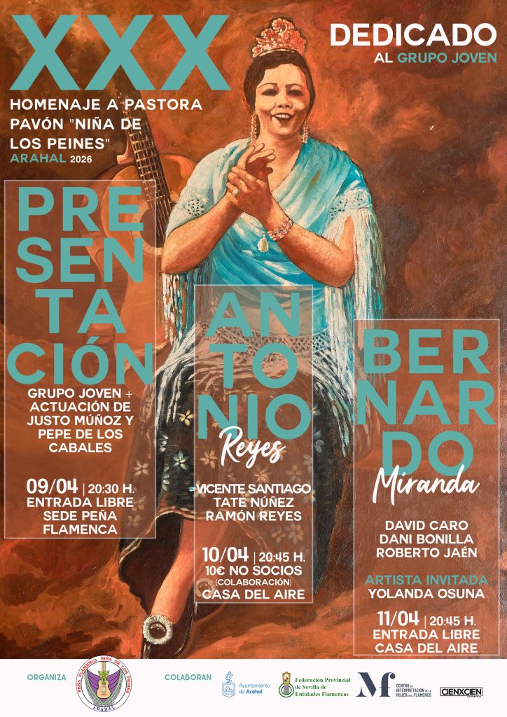 XXX Homenaje a Pastora Pavón «Niña de los Peines» 2026 dedicado al GRUPO JOVEN. La programación se llevará acabo en la sede de la peña flamenca y casa del aire de Arahal (Sevilla) calle Vera Cruz n,2. Del 9 de abril al 11 de abril.